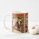 Dogs love classical music. At some animal shelters, the dogs go to sleep each night with the soothing sounds of classical music. When the music begins, they all stop barking and settle down to sweet dreams. The designs in this "Dogs love classical music." series celebrate the intuitive connection between dogs and this wonderful music. The design on this mug features a portrait of the composer Wolfgang Amadeus Mozart. The portrait is in an ornate gold frame, on a wallpaper background of golden bunches of grapes against deep purple. In front is a photo of a dog, commenting (in English and French), and pointing with red arrows to the composer. The text says "It's Mozart".