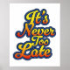 It's never too late retro style font inspirational quote.
