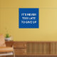 "It's never too late to give up" is a funny sassy demotivational quote here on a blue base.