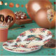 The design on these paper plates have a vintage floral style. There is a very colourful umbrella with a bouquet of flowers around it.