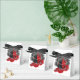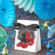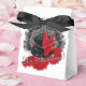 White tent-style with black ribbon favour box with a cabaret image, on the front and back, of a black top hat adorned with red feathers and a red bow, a black feather and bejeweled headpiece with roses, a red boa and the text, "It's Showtime! in gleaming silver French script. See matching invitation, confetti, favour bag, favour tag, gift bags, label, round sticker, custom-cut vinyl sticker and wrapping paper. See the entire Cancan Favour Box collection in the SPECIAL TOUCHES | Party Favours section.