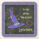 A fun square party paper coaster with a floating purple and teal blue enchanted witch hat that says "It's that Witchy Time Of Year, Let's Party" on a dark charcoal black background with a teal blue border. All the text is editable.