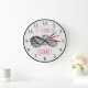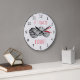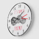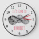 This white, round wall clock is the ideal gift for anyone who loves to crochet. It has black numbers, and in the centre is a skein of yarn, in shades of black, white and gray, with two red crochet hooks. Above and below are the words "It's time for crochet" in a modern, red, hand drawn text.