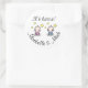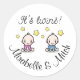 These charming round stickers feature two whimsical babies in pink and blue with a "It’s twins!" message on a neutral white background, customise with the twins names, perfect for gift and envelope seals, baby shower invitations, thank-you cards, or birth announcements for