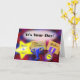 Background is marbled red and blue. Text reads from left to right, "You're the star, the champion, the hero," with corresponding images:star, trophy, and medal. Text backgrounds have a variety of textures. Inside message reads, "And you're surrounded by your fan club (all of us!) Happy Birthday!"