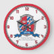 Knights style shield monogram letter I simple numbered wall clock in shades of red, blue white and grey. Personalise with your child's own name and name meaning for a personalised touch to your child's knights bedroom or nursery, this example is for young knights wit a name starting with the letter I. Currently reads Ivor Lord of the bow. Wise, dexterous and precise. Ideal for a gift to a new baby boy, for a christening, baby naming or baby shower gift. Other names and matching items are available. Unique shield drawing, graphic art, name research, wording and design by Sarah Trett for www.mylittleeden.com