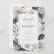 This elegant and modern wedding invitation is perfect for spring and summer. It features watercolor-painted Dahlia flowers and greenery around the border of contemporary typography. The colour scheme includes ivory beige, emerald green, and white. It's pretty, classic, and beautiful; the perfect design for your special day.