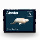 Another in the series of postage stamps for the notional independent nation of Alaska. Features a digital rendering of an beluga whale carved from mammoth ivory. The carving of ivory is a traditional craft of Alaska Natives. White is the predominant colour in this image on a dark blue-green background. The beluga or white whale, Delphinapterus leucas, is a small toothed whale found in both the Arctic and sub-Arctic. The English name comes from the Russian белуха (belukha), which derives from the word белый (belyy), meaning "white". It is sometimes referred to by scientists as the belukha whale to avoid confusion with the beluga sturgeon. The beluga is also colloquially known as the sea canary due of its high-pitched squeaks, squeals, clucks and whistles which can even be heard above the water. A Japanese researcher says he taught a beluga to "talk" by using these sounds to identify three different objects, offering hope that humans may one day be able to communicate effectively with sea mammals. Male belugas are larger than females. Length can range from 8.5 to 22 ft, averaging 13 ft in males and 12 ft in females. Males weigh from 2,400 to 3,500 lbs, while females weigh between 1,500 and 2,600 lbs. The beluga can live more than 50 years. Adult belugas are rarely mistaken for other species, as they are completely white or whitish-grey in colour. Calves, however, are usually grey. The beluga's head is unlike that of any other cetacean. Like most toothed whales it has a melon—an oily, fatty tissue lump found at the centre of the forehead. The beluga's melon is extremely bulbous and even malleable. The beluga is able to change the shape of its head by blowing air around its sinuses. Unlike many dolphins and whales, the vertebrae in the neck are not fused together, giving it a flexible, well-defined neck and allowing the animal to turn its head laterally. The rostrum has about 8 to 10 teeth on each side of the jaw and a total of 34 to 40 teeth. Unlike most whales, it is capable of swimming backwards. The beluga molts seasonally. Belugas have a dorsal ridge, rather than a dorsal fin. The absence of the dorsal fin is reflected in the genus name of the species—apterus the Greek word for "wingless." The evolutionary preference for a dorsal ridge rather than a fin is believed to be an adaptation to under-ice conditions, or possibly as a way of preserving heat. As in other cetaceans, the thyroid gland is relatively large compared to terrestrial mammals (proportionally three times as large as a horse's thyroid) and may help to sustain higher metabolism during the summer estuarine occupations. Its body is round, particularly when well-fed, and tapers less smoothly to the head than the tail. The sudden tapering to the base of its neck gives it the appearance of shoulders, unique among cetaceans. The tail fin grows and becomes increasingly and ornately curved as the animal ages. The flippers are broad and short—making them almost square-shaped. The beluga inhabits a discontinuous circumpolar distribution in Arctic and sub-Arctic waters ranging from 50°N to 80°N, particularly along the coasts of Alaska, Canada, Greenland, and Russia. The southernmost extent of their range includes isolated populations in the St. Lawrence River estuary and the Saguenay fjord, around the village of Tadoussac, Quebec, in the Atlantic and the Amur River delta, the Shantar Islands and the waters surrounding Sakhalin Island in the Sea of Okhotsk. In the spring, the beluga moves to its summer grounds: bays, estuaries and other shallow inlets. These summer sites are discontinuous. A mother usually returns to the same site year after year. As its summer homes clog with ice during autumn, the beluga moves away for winter. Most travel in the direction of the advancing icepack and stay close to its edge for the winter months. Others stay under the icepack—surviving by finding ice leads and polynyas (patches of open water in the ice) in which they can surface to breathe. Beluga may also find air pockets trapped under the ice. The beluga's ability to find the thin slivers of open water within a dense ice pack that may cover more than 96% of the surface mystifies scientists. Its echo-location capabilities are highly adapted to the sub-ice sea's peculiar acoustics and it has been suggested that belugas can sense open water through echo-location. In 1849, while constructing the first railroad between Rutland and Burlington in Vermont, workers unearthed the bones of a mysterious animal in the town of Charlotte. Buried nearly 10 feet (3.0 m) below the surface in a thick blue clay, these bones were unlike those of any animal previously discovered in Vermont. Experts identified the bones as those of a beluga. Because Charlotte is over 150 miles (240 km) from the nearest ocean, early naturalists were at a loss to explain the bones of a marine mammal buried beneath the fields of rural Vermont. Today, the Charlotte whale aids in the study of the geology and the history of the Champlain Basin,and this fossil is now the official Vermont State Fossil (making Vermont the only state whose official fossil is that of a still extant animal). Belugas are highly sociable. Groups of males may number in the hundreds, while mothers with calves generally mix in slightly smaller groups. When pods aggregate in estuaries, they may number in the thousands. This can represent a significant proportion of the entire population and is when they are most vulnerable to hunting. Pods tend to be unstable, meaning that they tend to move from pod to pod. Radio tracking has shown that belugas can start out in a pod and within a few days be hundreds of miles away from that pod. Mothers and calves form the beluga's closest social relationship. Calves often return to the same estuary as their mother in the summer, meeting her sometimes even after becoming fully mature. Belugas can be playful—they may spit at humans or other whales. It is not unusual fo