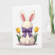 This card features a small bunny 🐰 seen from behind on a bright white background, giving the scene a shy, affectionate feel as if it’s waiting for someone special to notice. The bunny is shaded in creamy ivory with soft gradients, and its long ears rise upward with a light pink tint on the inner edges. A rich violet ribbon is tied into a glossy bow at the base of its neck, adding a dressed-up touch like it’s ready for a sweet springtime visit. A round, fluffy white tail sits just below, with textured fur that contrasts against the smoother body and sleek ribbon. On either side of the bunny, two yellow flowers 🌷 stand in a balanced arrangement, each with green stems and leafy accents that frame the center figure like a gentle welcome. The greeting text sits near the top in a soft lavender tone, with smaller text placed near the bottom in muted gray to keep the focus on the illustration. A faint shadow beneath the bunny and flowers lightly grounds the scene on the white space.