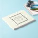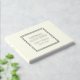 Solid ivory color, simple wedding guest book with stylized foil print within a square border that features the bride and groom's name along with wedding date in your choice of color foil print. Seen here in silver foil print. Select your guest book style.