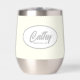 Gift your wedding bridesmaid with this trendy and personalized, stainless steel wine tumbler with her name in stylized, grey script inside a white, oval design. Background color is an ivory color. Perfect for a bachelorette party as well! Personalize your wine tumbler by editing and replacing bridesmaid name with desired name. Available in many, popular bridal party color schemes.