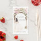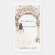A large marble arch decorated with lavender colored florals. A girl with an ivory colored dress. Personalize and add a text, name, date.