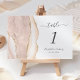 The left-hand edge of this elegant modern wedding table number card features an ivory watercolor agate border trimmed with faux gold glitter. The customizable text combines charcoal gray handwriting, italic and copperplate fonts on a white background.