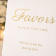 An elegant ivory and gold favors table sign designed to guide guests with timeless charm. The flowing script headline paired with refined serif typography creates a warm and graceful accent for weddings, 50th anniversaries, vow renewals, and formal receptions. Placed beside your dessert table or favor display, it gently invites guests to “Please Take One” while maintaining a cohesive luxury aesthetic. A sophisticated finishing detail that completes your celebration styling with understated elegance.