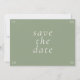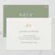 Whimsical and chic. This trendy wedding save the date card features a lovely blush rose watercolor floral illustration, alongside a contemporary set of fonts against a soft neutral ivory color at the front and contrasting green at the back.