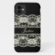 Ribbons of ivory lace and your name on a black background decorate this fashionable case.