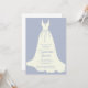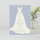 A beautiful wedding dress is the main feature of this bridal shower invitation. The ivory coloured gown features floral details and is set on a light purple background.