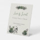 This elegant gothic Irish St. Patrick's Day Bridal Shower favours tabletop sign features hand-drawn Irish & gothic themed illustrations in black ink, showcasing a skull adorned with green roses, leaves, berries, wildflowers and green clovers. The back features a matching pattern with these same elements against the same pink background.