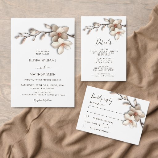 Ivory White Magnolia Textural Flower Wedding Invitation