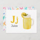 "Letter J is for Juice" in our Alphabet Flash Card set. Get all 26 letters of the alphabet! A double-sided postcard that is great for memory games and teaching, geared for education, schools, teachers and homeschoolers for kindergarten and babies. All text is editable if you need to customise.
