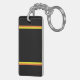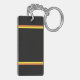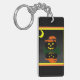 This is an image of a Jack O Lantern all dressed up. A black pumpkin with an orange witches hat is sitting on a bed of green leaves. The Jack o Lantern is lit up with bright eyes and a smile. A black backround was added so you can see his reflection. The keychains are available in assorted styles and sizes.