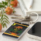 This is an image of a Jack O Lantern all dressed up. A black pumpkin with an orange witches hat is sitting on a bed of green leaves. The Jack o Lantern is lit up with bright eyes and a smile. A black backround was added so you can see his reflection. The keychains are available in assorted styles and sizes.