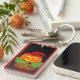 This is an image of a Jack O Lantern all dressed up. An orange pumpkin with a red witches hat is sitting on a bed of green leaves. The Jack o Lantern is lit up with bright eyes and a smile. A black backround was also added so you can see his reflection. A red border was added. These key chains are available in assorted styles and sizes.