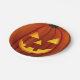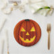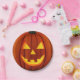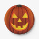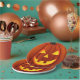Paper plates with a jack-o'-lantern face on the front. Great for Halloween.