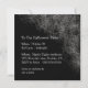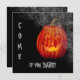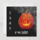 The front of this Halloween party invitation has a glowing orange jack-o-lantern peering out from a creepy corner spider web. The text on the side and bottom says "COME if you DARE!" in grey. The images and text are placed on a dramatic black background. The back of the invitation has four separate fields and plenty of room for your custom party information. Just the right amount of spooky and creepy! *Clip art used in this design is copyrighted by Encore Software, Inc., which permits use to its licensors. All rights reserved.