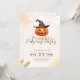This invitation captures the enchantment of Halloween with its radiant and thematic design. Set against a light orange backdrop adorned with shimmering orange glitter, stars, and candy, this invitation emanates the spirit of the season. At the top, a spooky jack-o'-lantern donning a witches hat takes centre stage, adding an eerie yet playful touch to your pumpkin carving celebration.