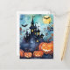 Halloween postcard featuring a watercolor illustration of a haunted mansion, the Moon, bats and jack o’lanterns.