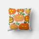 This throw pillow has a design of jack-o-lanterns with different faces repeating in each quarter.