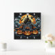 Three carved pumpkins with glowing faces sit in front of a haunted castle, illuminated by a mystical full moon and surrounded by ominous clouds and bats.