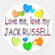 Jack Russell lovers can share their true feelings about their dog with this Love me, love my Jack Russell colourful design with hearts.