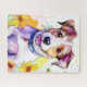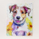 A digital art image of a cheerful Jack Russell Terrier dog with a colourful background is depicted with flowers surrounding it. The playful use of vibrant colours gives a lively feel to the scene.