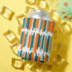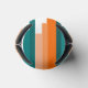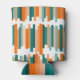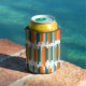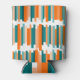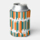 This can cooler has a pattern of lines in teal and orange in varying lengths.