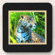 Here, kitty, kitty. Meet Nayla the gorgeous jaguar with sharp eyes and a lovely coat.The jaguar is a large felid species with a distinctively marked coat of pale yellow or tan coloured, with spots that transition to rosettes. Unfortunately, the jaguar is subject to poaching, habitat depletion, and other challenges to its existence, so scientists think its population is declining. This solitary, tree climber looks a tad like a leopard, but jaguars are bigger and live in different regions than leopards. This image is based on an original photograph with digital effects applied to give it a slightly textured effect, like an old-fashioned portrait.