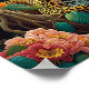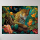 Jaguar illustrated in the branches of trees surrounded by vibrant tropical flowers in a tropical rain forest.