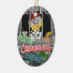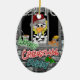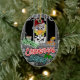 An animated Christmas female jail bird in her black and white striped prison garb, celebrating the holiday wearing her Christmas santa hat, peering out of her prison cell, behind bars. This funny jail bird Christmas ornament seals the memory of that less than stellar time spent in the pokey on Christmas. A must-have for the jailbird you know, love can’t stand, or otherwise…
