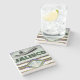 The coasters are gorgeous, a quality feel and heavy weight. They look like a precious archeological find. A rustic stone juxtaposed with a modern floral black and white print. I like the way the print goes slightly imperfect on the cut stone edges giving them a kind-of natural beauty.