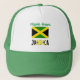 Jamaica and Jamaican Flag with green personalisation on a trucker hat. Design shows the flag with the word JAMAICA underneath in the colours of the flag. Above a place for a name in green letters. Great gift. Fun to wear to a Jamaican family reunion, travel group, or club meeting. Share your heritage wherever you go.