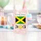 Add your name in green letters to this can glass for a personalised effect or gift, above the Jamaican flag with the word JAMAICA underneath, in the colours of the flag. Great way to share your love and pride in your ancestry, culture and heritage. Terrific for clubs or travel groups and reunions of family, friends and groups. Cool housewarming gift for a home bar.