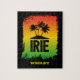IRIE Jamaican quote puzzle with black silhouette palm trees over a rasta colored sunset