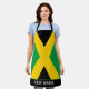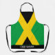 Bold Jamaican flag kitchen apron. Across the bottom of the apron is customisable text where you can your own name or slogan