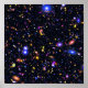 An enhanced pop art simulation of James Webb Space Telescope's field of view shows billions of galaxies with unprecedented clarity.