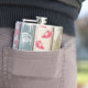 The flask itself is fine. It’s a cheap flask, obviously bought in bulk, however am prepared to overlook that. Given that it is a personalized item, I would have liked to have seen gift boxing instead of the generic packaging. Terrible printing, and/or quality. It’s a cheap, tacky vinyl. It is not cut straight and is also applied in a way that it is overhanging the bottom, causing the glue to catch on items and it will eventually roll and tear, damaging the wrap.