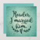 This design for book lovers has the famous quote from the ending of Charlotte Bronte's Jane Eyre when she marries Mr. Rochester. "Reader, I married him".