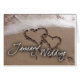Two hearts in the sand with ocean waves and January Wedding in white script font. Perfect design to announce your upcoming January wedding. Love on the beach!