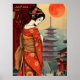 This stunning, elegant poster of Japan features a beautiful geisha, pagoda temples, and a big red sun - the symbol of Japan.