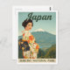 An elegant vintage-style travel poster inviting you to Hakone National Park, Japan. The beautiful illustration features a woman dressed in a colorful Kimono and traditional attire, set against the breathtaking, iconic view of Mount Fuji. This artwork captures the serene and classic beauty of Japanese culture and landscape. It's the perfect postcard for travel lovers, fans of Japanese art, or collectors of retro illustration and Asian-themed designs.